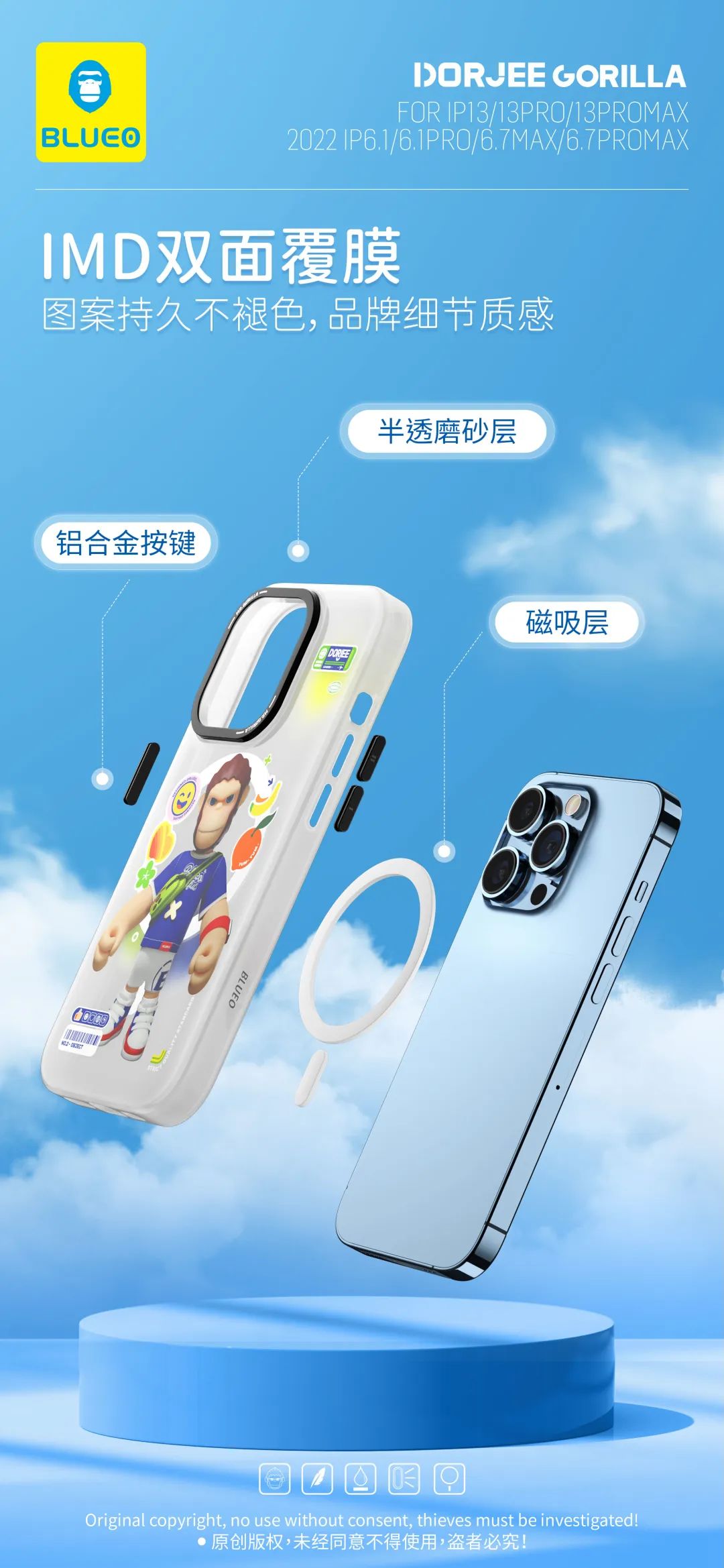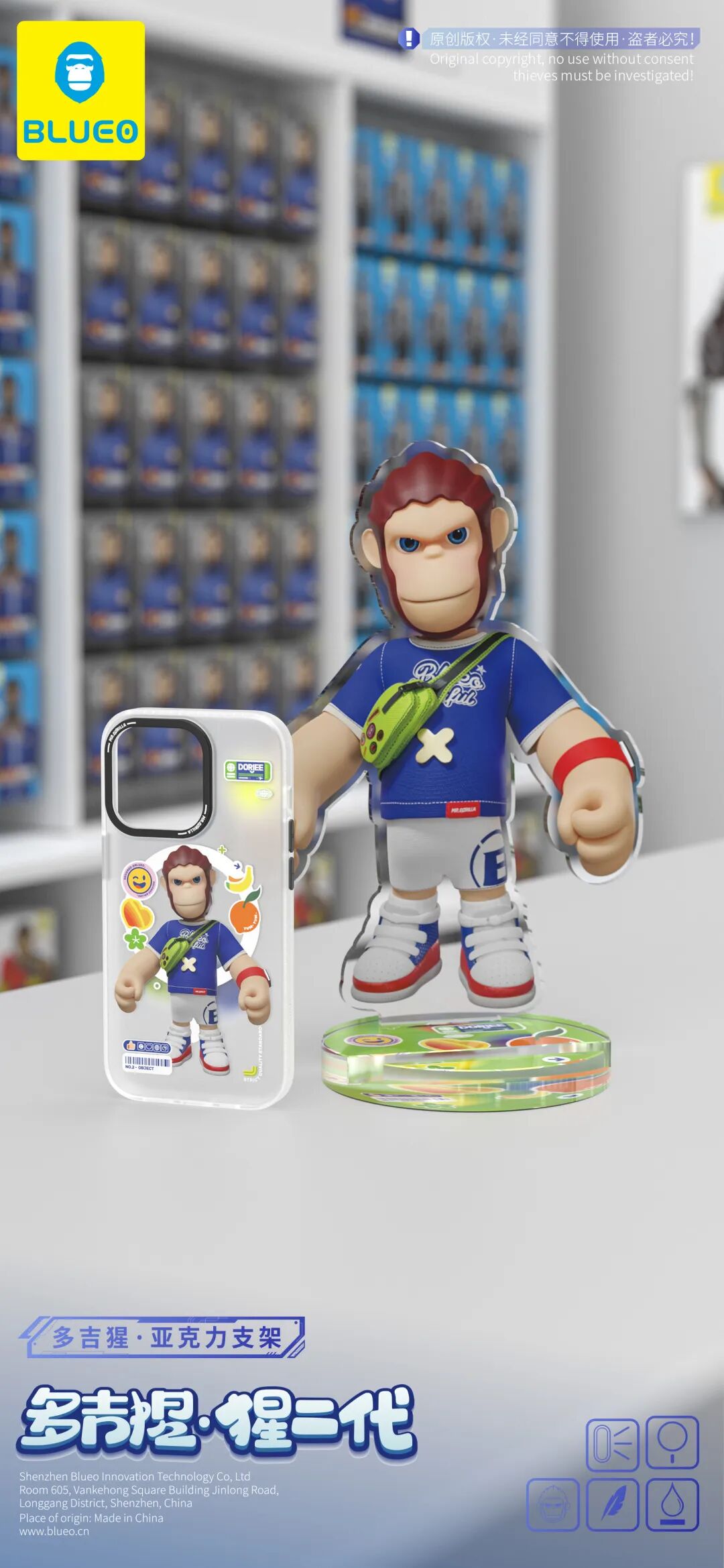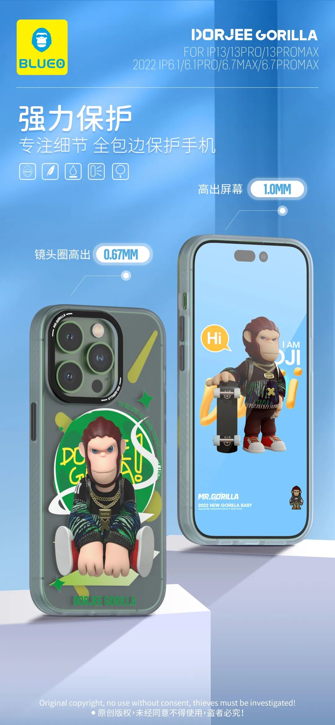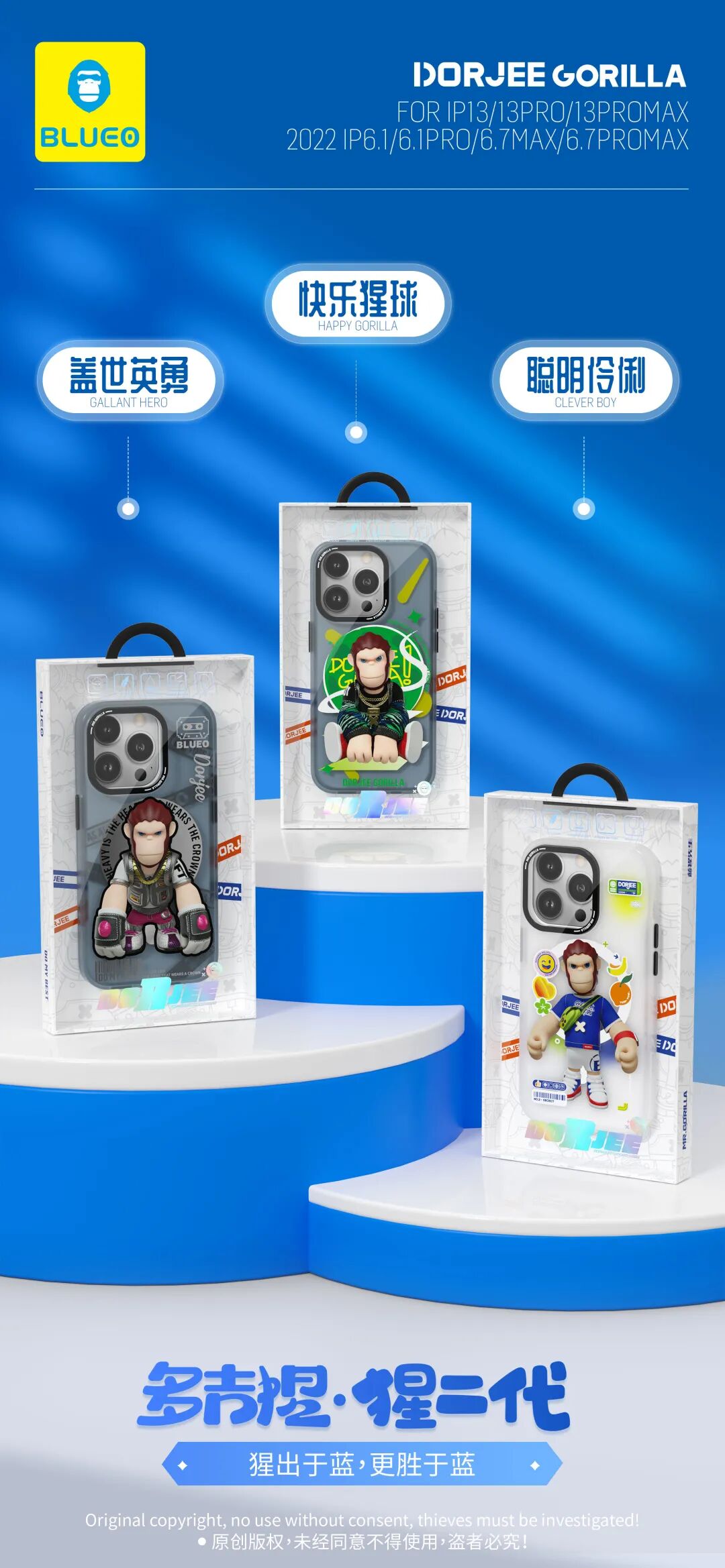 协会本期新品推荐 深圳市蓝橙创新科技有限公司 深圳市蓝橙创新科技有限公司(简称“蓝橙”)创立于2014年8月,主要研发生产、销售手机保护类等周边产品,型号涉及苹果、三星、华为、小米、OPPO、VIVO、1+等主流机型。经多年国内外口碑积累,凭借产品线专业齐全、行业高品质标准输出、工艺不断创新升级,以及高识别度的品牌IP形象、持续加强的渠道管控能力,成为行业内较受欢迎的中高端手机保护细分类品牌。 # 多吉猩·猩二代系列2022磁吸防摔保护壳 # 新品推荐 多吉猩·猩二代系列2022磁吸防摔保护壳,以多吉猩盖世英勇、快乐猩球、聪明伶俐三种显著性格特点打造出三种款式,搭配亚克力展示支架使用方便又炫酷。采用IMD双面覆膜,图案持久不褪色;半透磨砂质感,手感细腻,抗油污抗指纹。全包边保护手机,铝合金独立按键增强反馈感,内置四角防摔气囊,减震防摔。