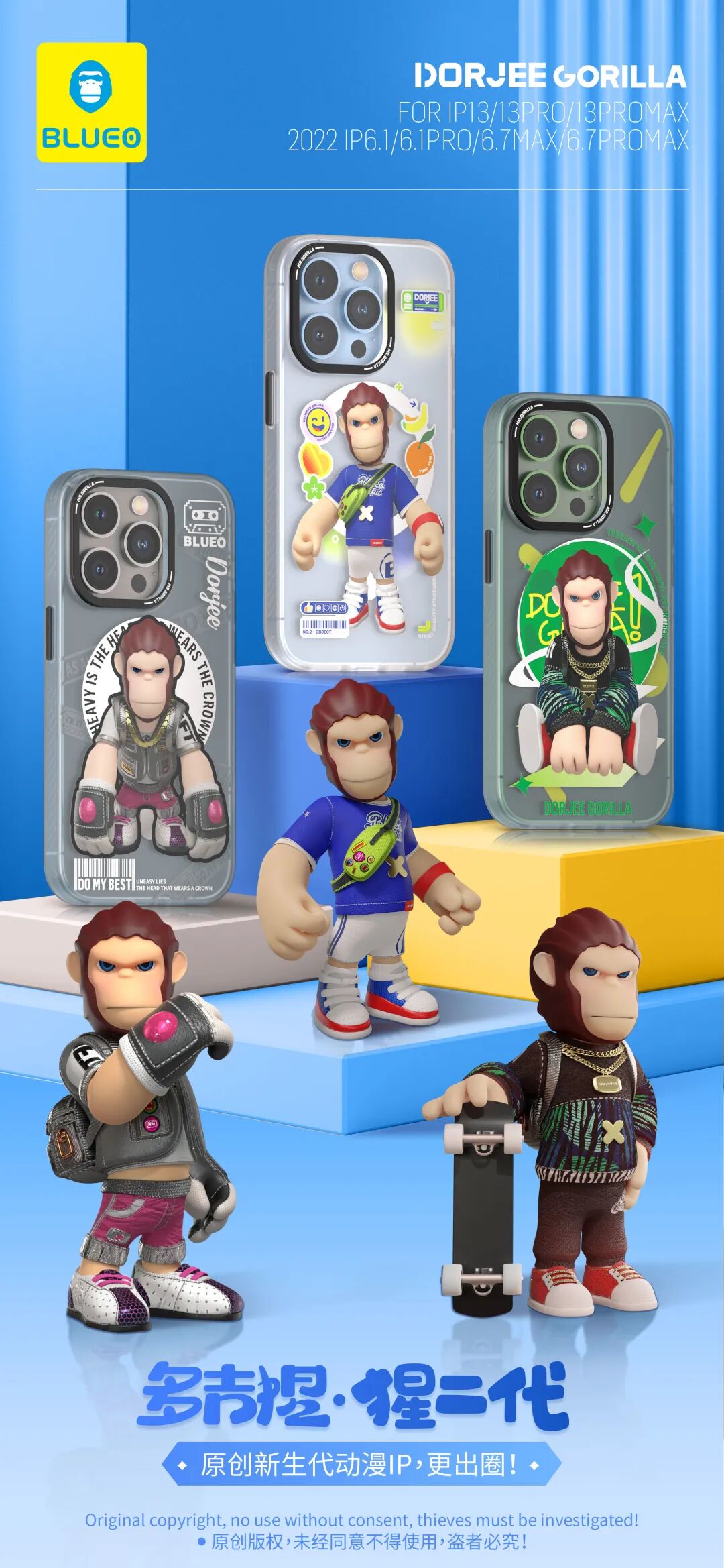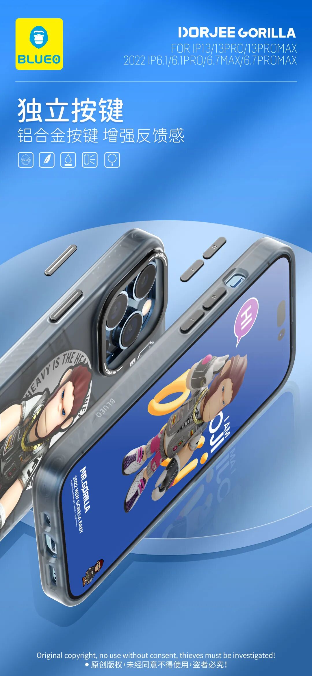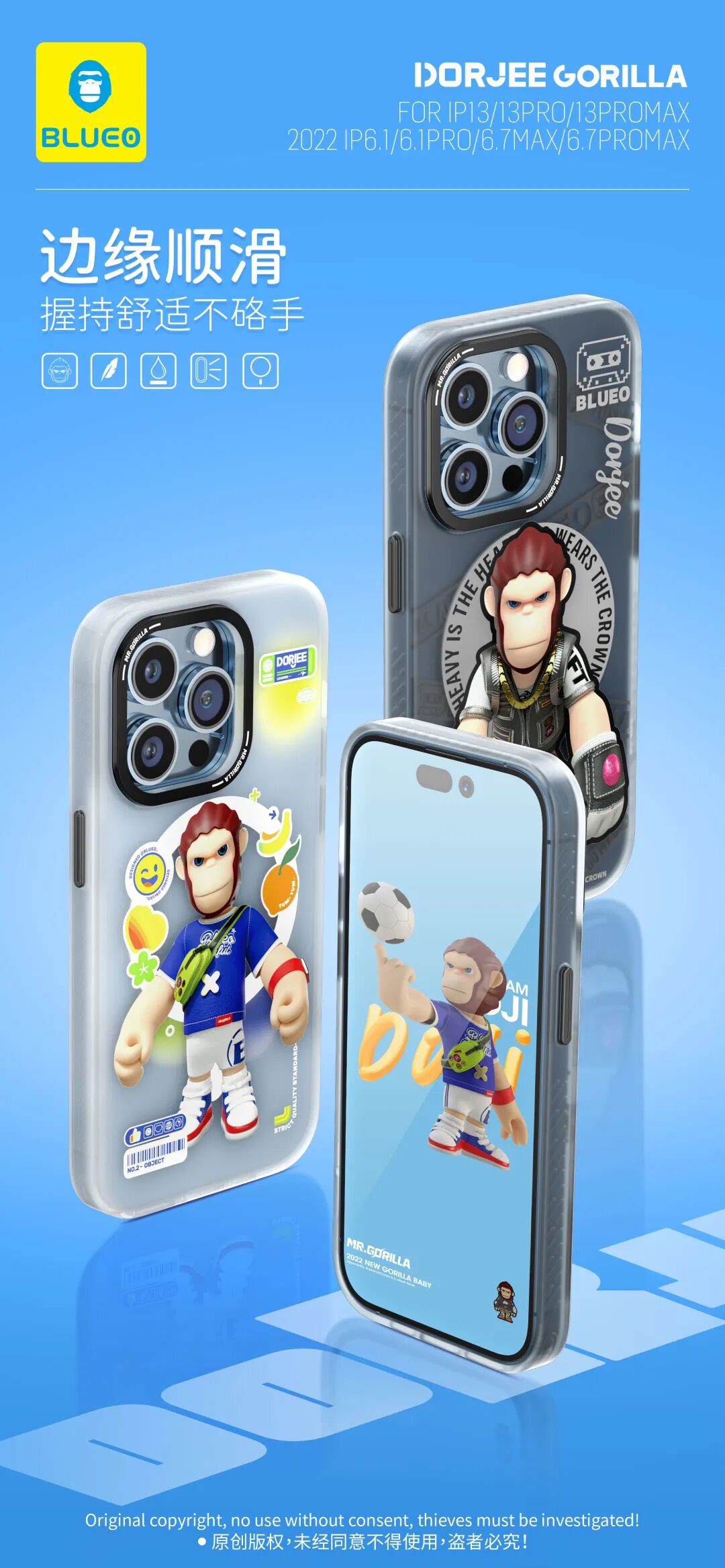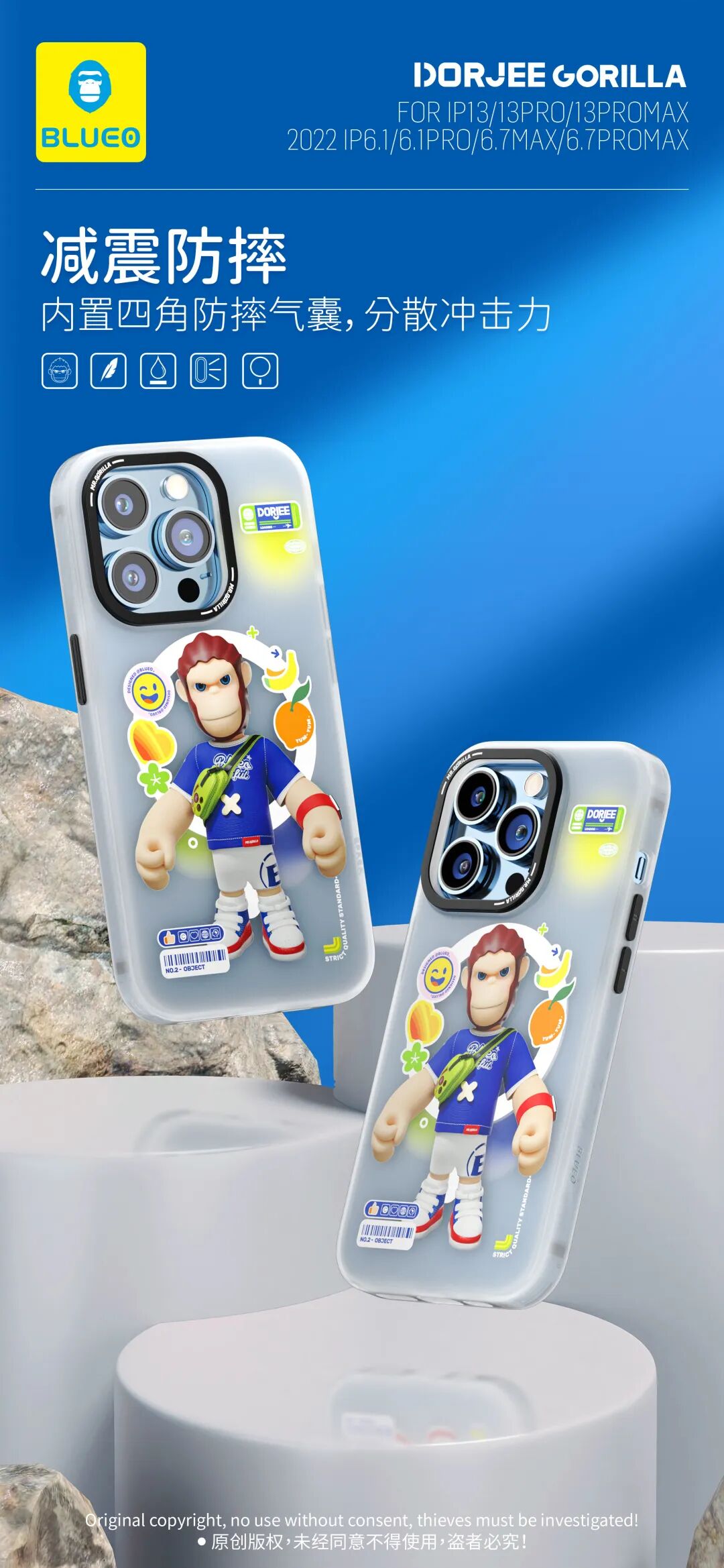 协会本期新品推荐 深圳市蓝橙创新科技有限公司 深圳市蓝橙创新科技有限公司(简称“蓝橙”)创立于2014年8月,主要研发生产、销售手机保护类等周边产品,型号涉及苹果、三星、华为、小米、OPPO、VIVO、1+等主流机型。经多年国内外口碑积累,凭借产品线专业齐全、行业高品质标准输出、工艺不断创新升级,以及高识别度的品牌IP形象、持续加强的渠道管控能力,成为行业内较受欢迎的中高端手机保护细分类品牌。 # 多吉猩·猩二代系列2022磁吸防摔保护壳 # 新品推荐 多吉猩·猩二代系列2022磁吸防摔保护壳,以多吉猩盖世英勇、快乐猩球、聪明伶俐三种显著性格特点打造出三种款式,搭配亚克力展示支架使用方便又炫酷。采用IMD双面覆膜,图案持久不褪色;半透磨砂质感,手感细腻,抗油污抗指纹。全包边保护手机,铝合金独立按键增强反馈感,内置四角防摔气囊,减震防摔。