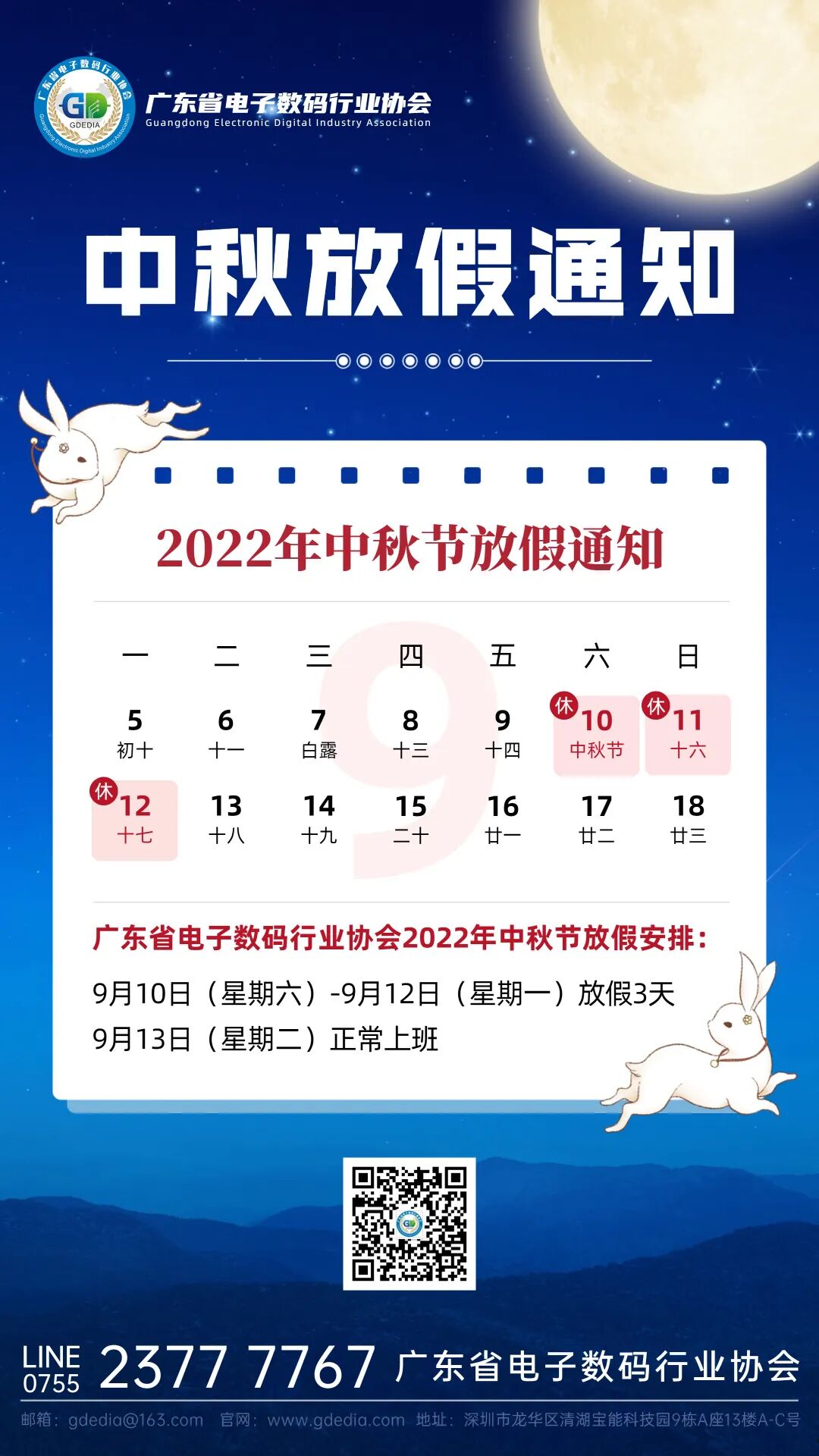 02 我会关于2022年中秋节放假安排的通知 一轮明月千里共,一声祝福遥相送。中秋佳节即将到来,我会9月10日-9月12日放假3天,9月13日(星期二)正常上班。浓情中秋,我会祝愿您生活圆如月,家庭甜如蜜,事业顺如风。中秋快乐,阖家幸福!