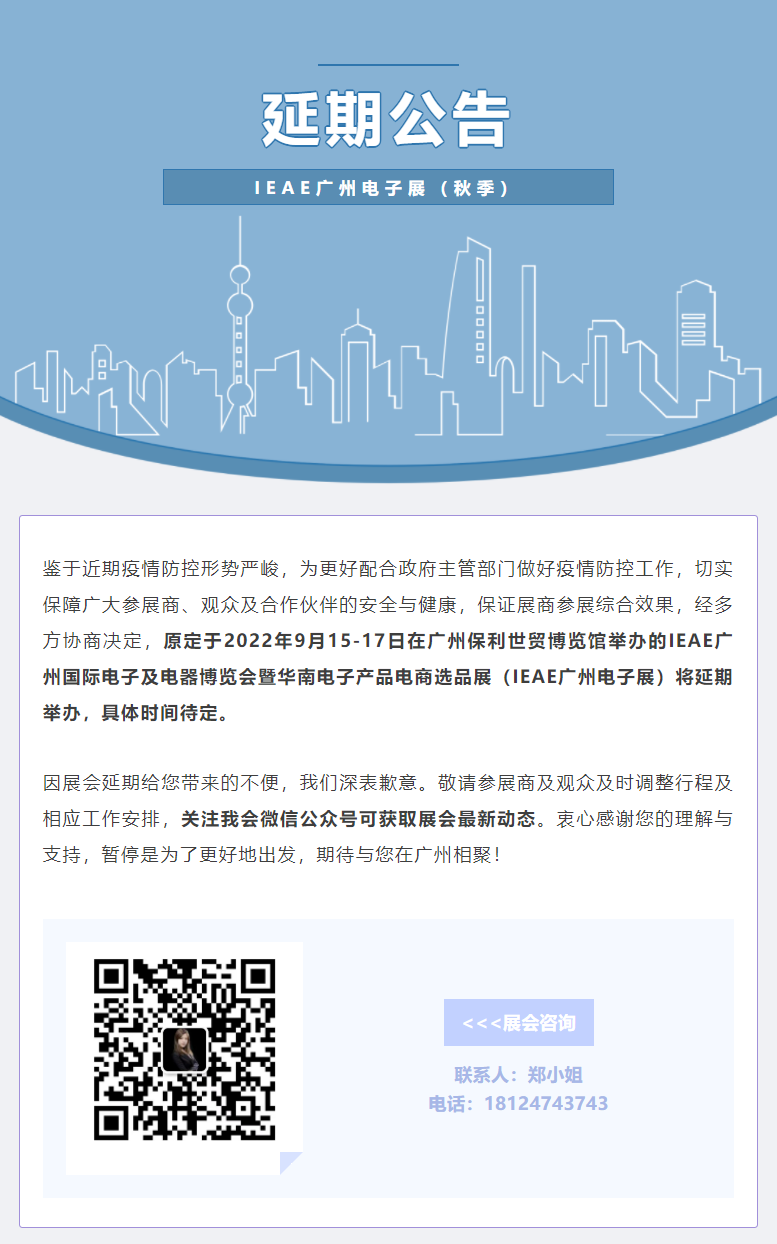 协会资讯 01 关于IEAE广州电子展(秋季)延期举办的通知 鉴于近期疫情防控形势严峻,为更好的配合政府主管部门做好疫情防控工作,切实保障广大参展商及观众的安全与健康,经多方协商决定,原定于2022年9月15-17日在广州保利世贸博览馆举办的IEAE广州电子展将延期举办,具体时间待定,关注我会微信公众号可获取展会最新动态。衷心感谢您的理解与支持,暂停是为了更好地出发,期待与您在广州相聚!