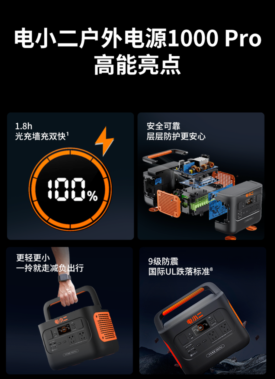 # 电小二户外电源1000pro # 新品推荐 电小二户外电源1000pro,双快充最快1.8h充满;智能风控排温系统比行业标准再低5℃;9级防震轻松应对道路颠簸情况;折叠把手设计,体重更轻,体积小巧不占地。向光而行,岂止于快,户外露营,一台到位。 编辑/JayZhang、Liana 排版/JayZhang 视频剪辑/Colourful 协会大事记