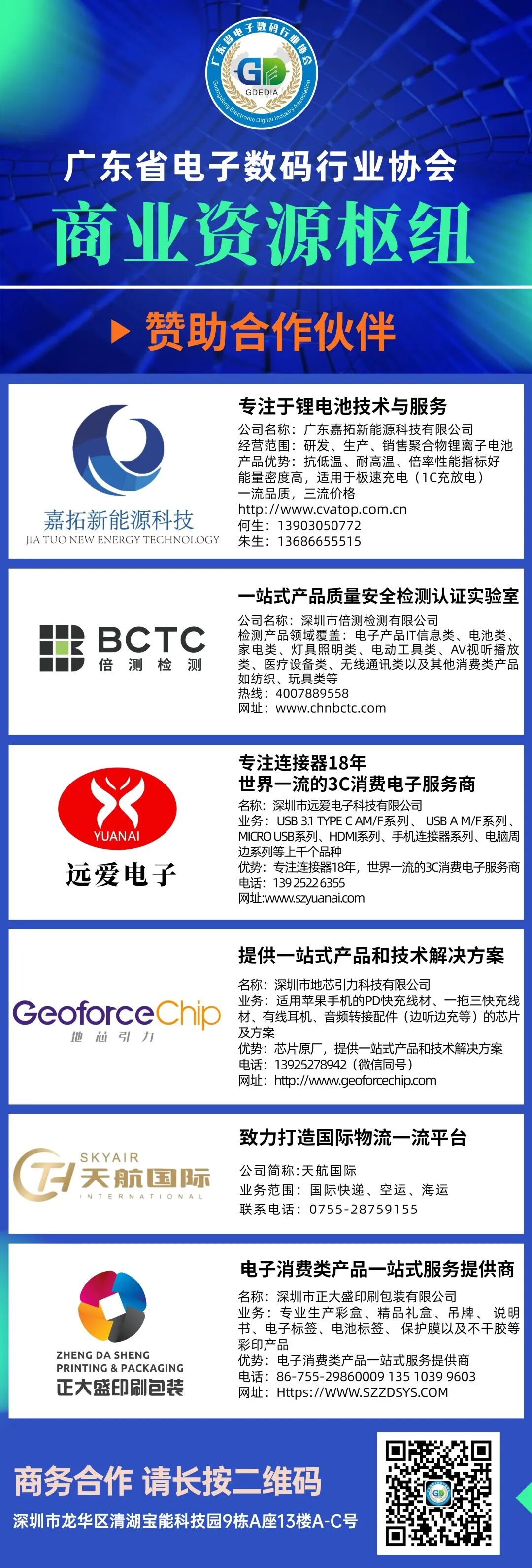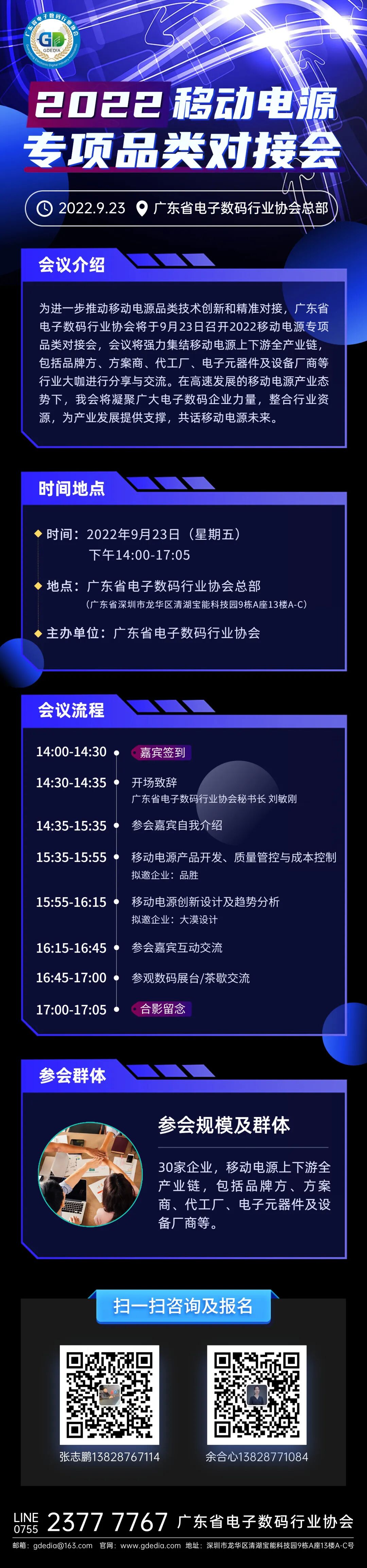 协会资讯 01 2022移动电源专项品类对接会9月23日隆重召开 为进一步推动移动电源品类技术创新和精准对接,广东省电子数码行业协会将于9月23日召开2022移动电源专项品类对接会,会议将强力集结移动电源上下游全产业链,包括品牌方、方案商、代工厂、电子元器件及设备厂商等行业大咖进行分享与交流。在高速发展的移动电源产业态势下,我会将凝聚广大电子数码企业力量,整合行业资源,为产业发展提供支撑,共话移动电源未来。