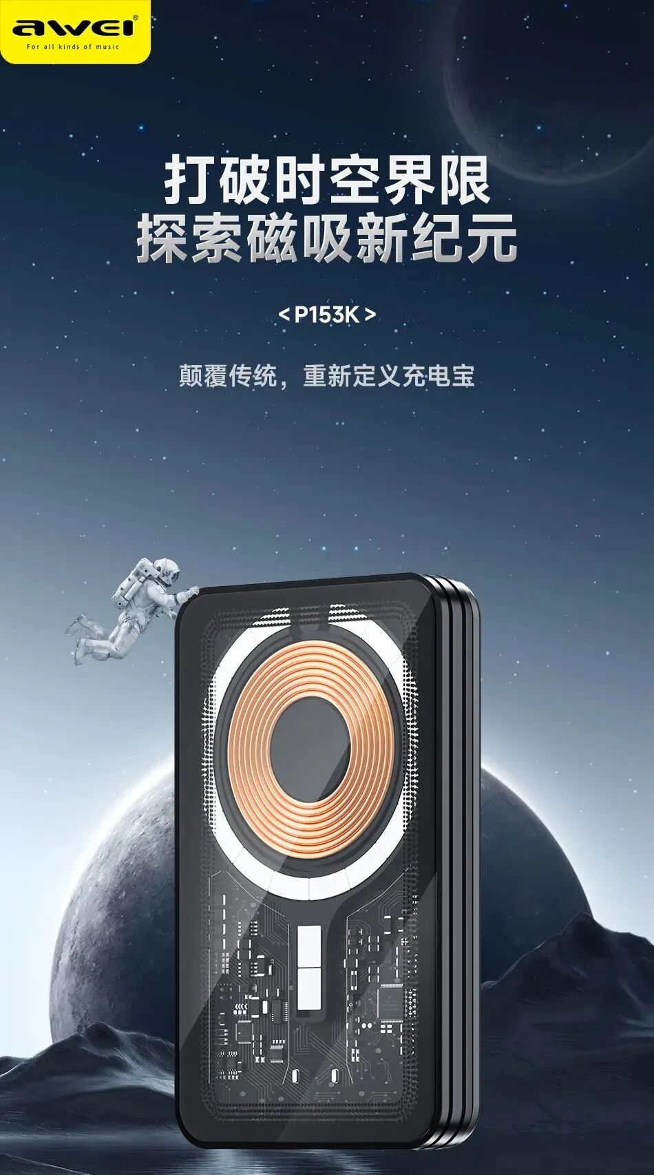 协会本期新品推荐 深圳市雅乐电子有限公司 深圳市雅乐电子有限公司为知名的3C数码消费电子企业,成立10年来,旗下品牌AWEI用维始终坚持以用户为中心,以科技创新为依托,致力于高端智能穿戴产品的研发、设计、生产、销售与服务等;产品体系覆盖蓝牙耳机、蓝牙音箱、线控耳机、移动电源、数据线、车载充电器等。 # P153k透明无线充移动电源 # 新品推荐 卡泼时空界限,探索磁吸新纪元的AWEI用维P153k透明无线充移动电源。15W大功率强劲闪充,无需着急等待;搭载新一代智能芯片,稳定不发烫;强劲磁力,稳固吸附,带电池超长续航,满足一天的出行充电需求。